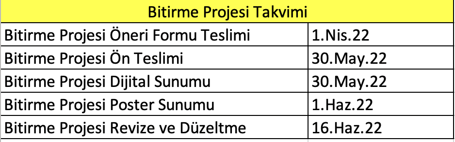 Bitirme projeleri kılavuzda belirtilen kurallar çerçevesinde hazırlanmalıdır. Takvimde belirtilen tarihlerde; öneri formu teslimi, bitirme projesi teslimi ve sunum tarihleri bulunmaktadır.
